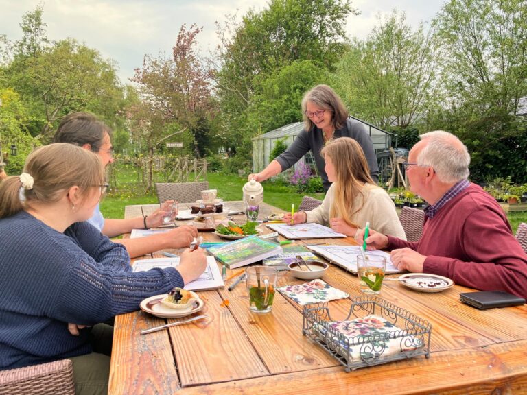 Heiligenbloem Caerulea en Beemdkroon Snorzweefvlieg op een paardenbloem Grote groene sabelsprinkhaan Herfststijlloos Jonge egel Vruchten van de peperboom Mini High tea tijdens de workshop van Studio Loof